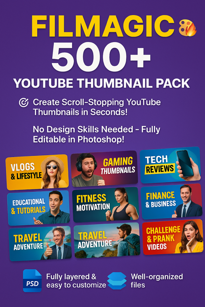 🖼️ Create Scroll-Stopping Thumbnails That Drive Views! Want more clicks, views, and viral reach on YouTube? Filmagic’s 500+ YouTube Thumbnail Pack is the ultimate toolkit to skyrocket your video’s Click-Through Rate (CTR) with professionally designed, fully editable PSD templates that look stunning and convert like magic. 🎯 No design skills needed – Just plug and […]